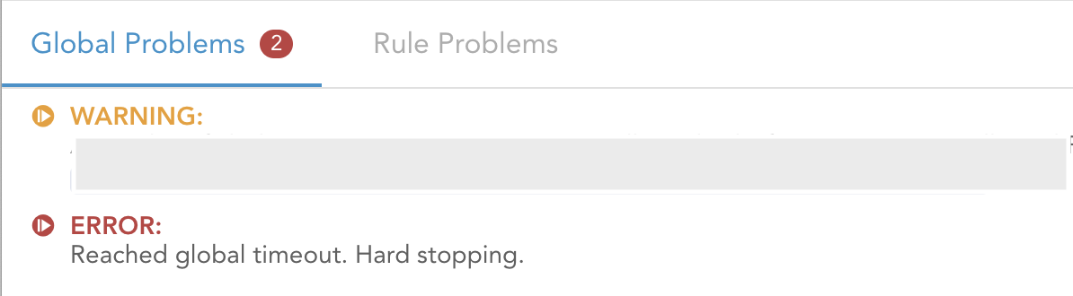 Types 1. and 2. are signified by a hard stop of the Prover. That means the Prover ran into the timeout of the cloud job, which is set at 2 hours, and was forcefully shut down from everything it was doing (it is possible to lower that timeout using the global_timeout flag). A message like “hard stop reached” appears in the “Global problems” pane of the report, and error symbols next to one or many rules.