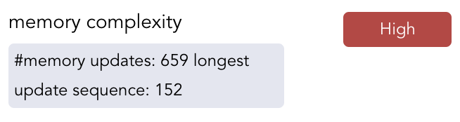Under this model, “memory updates” is a measure of how many times we store into a key-value mapping such as memory, storage, or a ghost function. The “longest update sequence” statistic represents the length the longest sequence of updates (i.e. store operations) performed on one of the mappings. In both cases, a smaller number indicates a less difficult problem for the Prover to solve.