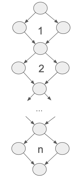 Illustration of path explosion through a sequence of n “diamond” shapes in the control flow graph. The shown control flow graph has 2n paths.